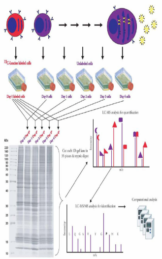 SILAC的是分別用天然同位素(輕型)或穩定同位素(重型)標記的必需氨基酸取代細胞培養基中相應氨基酸,細胞經5-6個倍增周期后,穩定同位素的氨基酸完全摻入到細胞新合成的蛋白質中替代了原有氨基酸。不同標記細胞的裂解蛋白按細胞數或蛋白量等比例混合,經分離、純化后進行質譜鑒定。