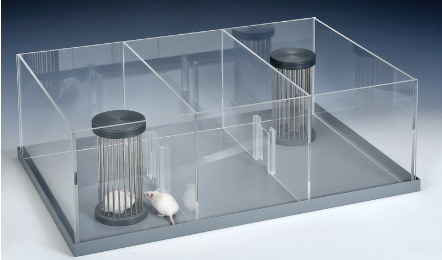 社會交互行為測試(3-Chambered Social Test)是最常用的用于評估自閉癥行為的實驗。動物交際實驗系統設計是在小鼠熟悉了環境后,檢測小鼠靠近位于實驗箱中裝有另一只陌生小鼠的金屬籠的時間,來判斷小鼠的社交能力。在實驗中,通常會比較小鼠靠近關有熟悉小鼠的金屬籠時間與陌生小鼠金屬籠的時間,來判斷動物的社交能力。