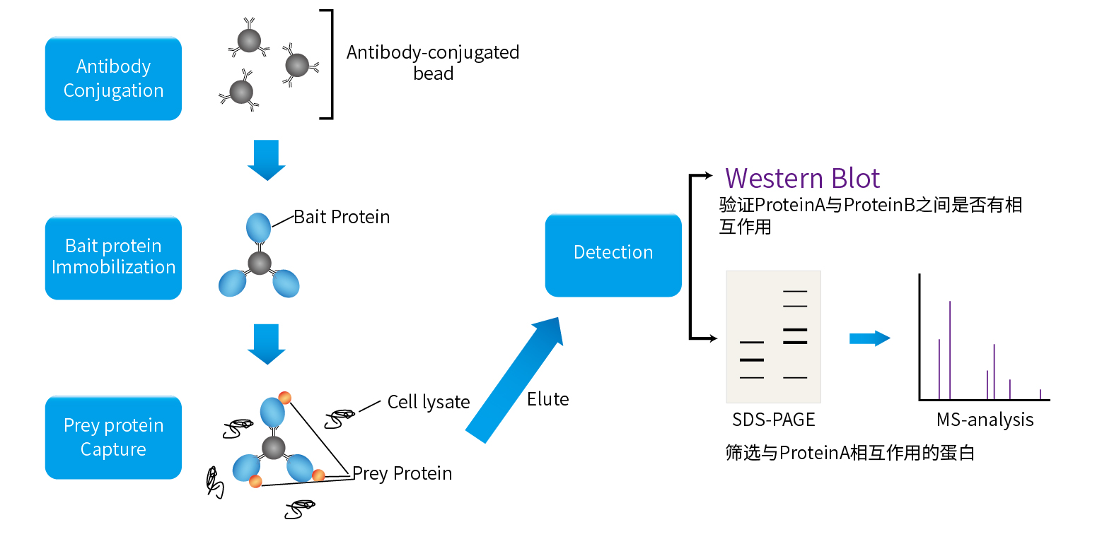 免疫共沉淀(Co-Immunoprecipitation)是以抗體和抗原之間的專一性作用為基礎的用于研究蛋白質相互作用的經典方法。 是確定兩種蛋白質在完整細胞內生理性相互作用的有效方法。 細胞在非變性條件下被裂解時,細胞內存在的許多蛋白質-蛋白質間的相互作用被保留了下來。當用預先固化在argarose beads或者magnetic beads上的蛋白質A的抗體免疫沉淀A蛋白,那么與A蛋白在體內結合的蛋白質B也能一起沉淀下來。