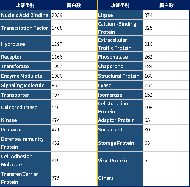 20K人類蛋白組芯片通過化學修飾共價結合19275種人類蛋白質和119種小鼠蛋白質。這些蛋白廣泛覆蓋受體、轉錄因子、激酶、胞外基質蛋白、細胞骨架蛋白等30余種蛋白類型,可用于多種生物學功能的創新研究。