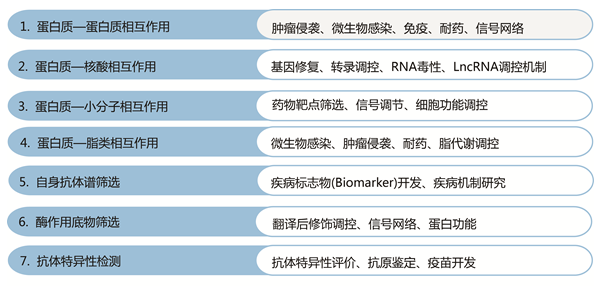 20K人類蛋白組芯片適用于以蛋白質相互作用為基礎原理的各種研究領域,具備廣泛的應用價值。在蛋白與蛋白相互作用篩選、蛋白與核酸相互作用鑒定方面相比傳統的Co-IP聯合質譜鑒定的技術路線,更加高效和準確。在小分子藥靶鑒定、單克隆抗體特異性篩選、脂類結合蛋白篩選、酶作用底物鑒定及自身抗體類biomarker的篩選等應用中,其技術優勢不可替代。